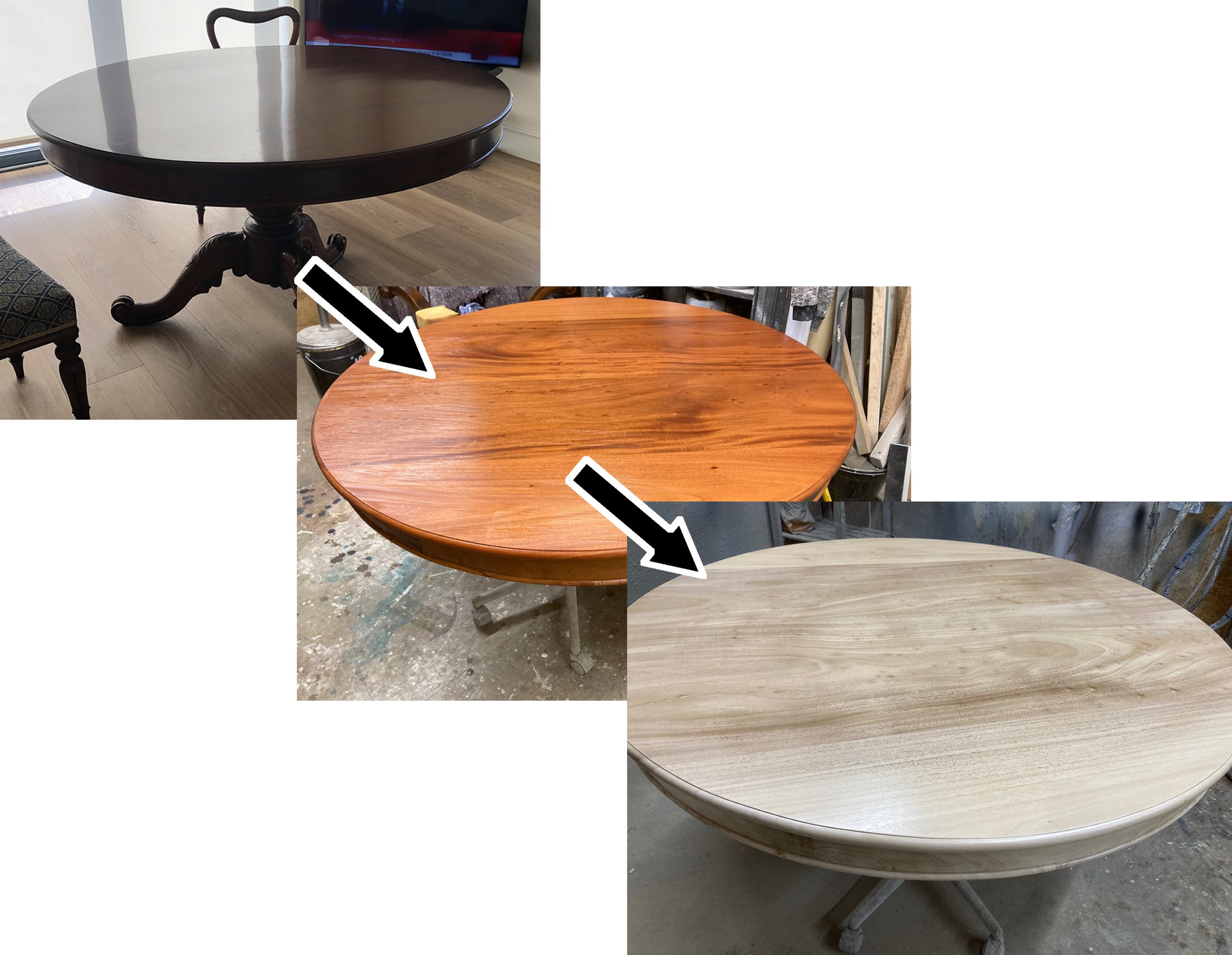 (top): Original Dark Mahogany finish, (middle): Post stripping/start of bleach process, (bottom): Result after 2+ bleachings then clear finished.